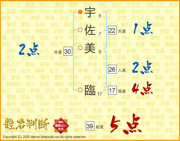 宇(6画)佐(7画)美(9画) 臨(17画)