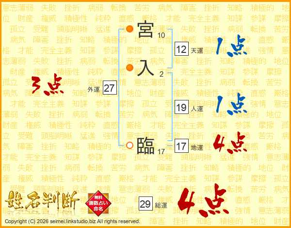 生活面を象徴する運勢です。外部から受ける影響力を表し、結婚運、家庭運や職場、環境への順応性を表します。総運から人運を引いた画数。姓や名が1文字の場合を除く。