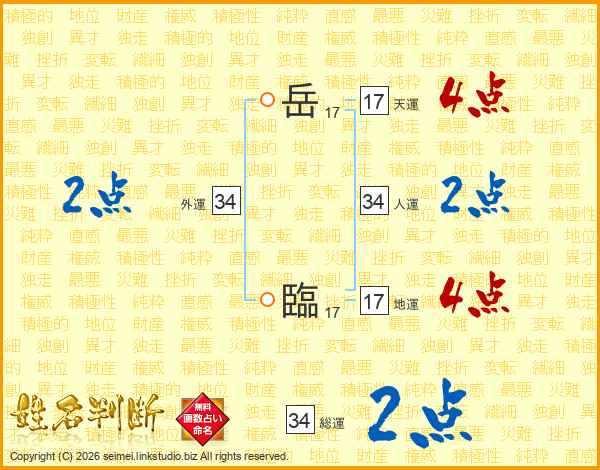 生活面を象徴する運勢です。外部から受ける影響力を表し、結婚運、家庭運や職場、環境への順応性を表します。総運から人運を引いた画数。姓や名が1文字の場合を除く。