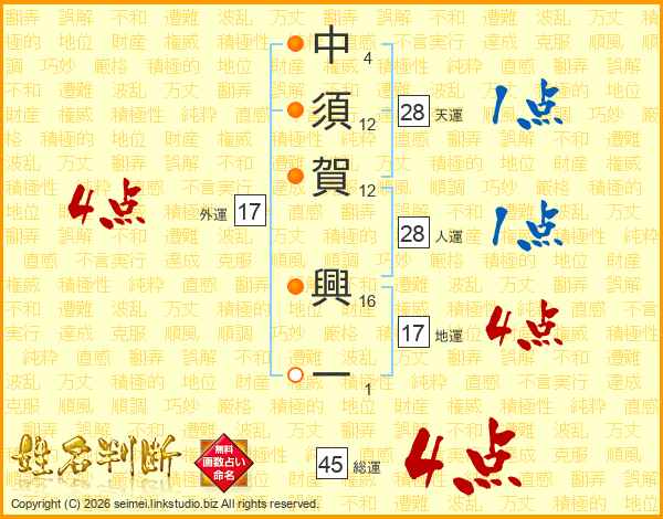 中(4画)須(12画)賀(12画) 興(16画)一(1画)