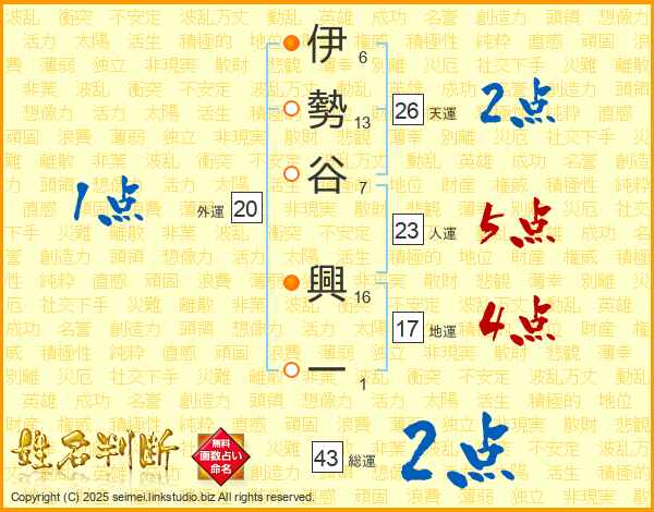 伊(6画)勢(13画)谷(7画) 興(16画)一(1画)