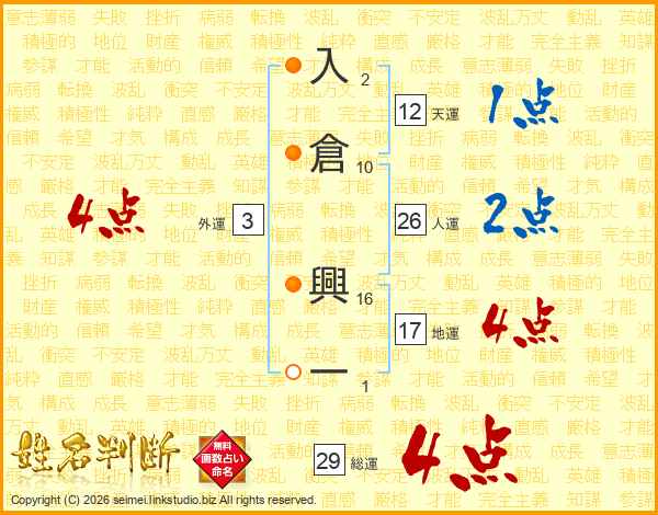 生活面を象徴する運勢です。外部から受ける影響力を表し、結婚運、家庭運や職場、環境への順応性を表します。総運から人運を引いた画数。姓や名が1文字の場合を除く。