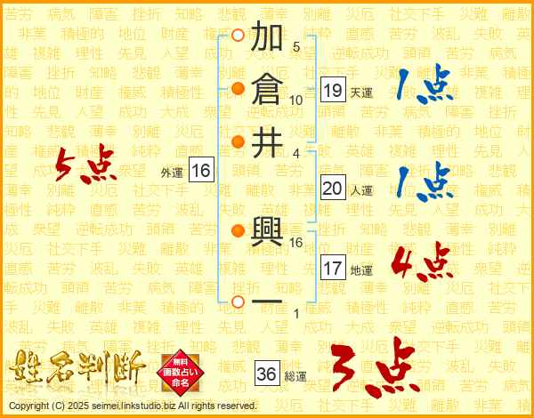 加(5画)倉(10画)井(4画) 興(16画)一(1画)