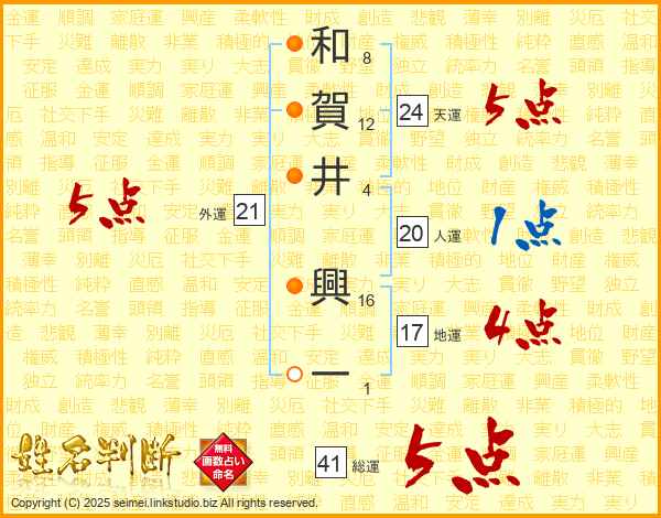 和賀井興一さんの天運は24画の5点!