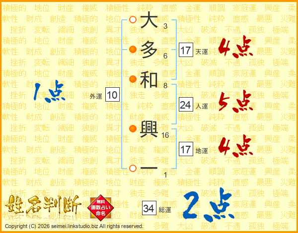 大(3画)多(6画)和(8画) 興(16画)一(1画)