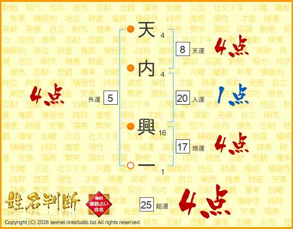 生活面を象徴する運勢です。外部から受ける影響力を表し、結婚運、家庭運や職場、環境への順応性を表します。総運から人運を引いた画数。姓や名が1文字の場合を除く。