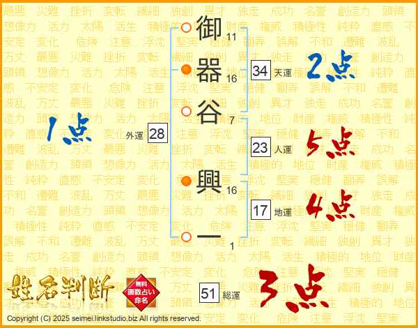 御(11画)器(16画)谷(7画) 興(16画)一(1画)