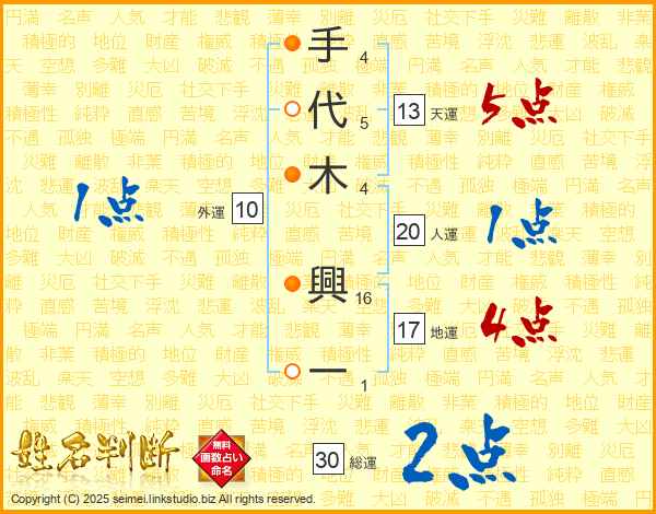 手(4画)代(5画)木(4画) 興(16画)一(1画)