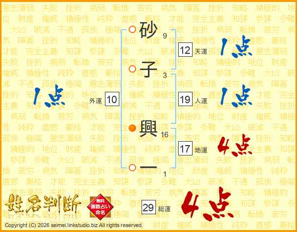 生活面を象徴する運勢です。外部から受ける影響力を表し、結婚運、家庭運や職場、環境への順応性を表します。総運から人運を引いた画数。姓や名が1文字の場合を除く。