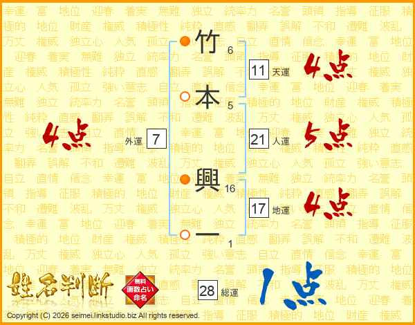 竹本興一さんの天運は11画の4点!