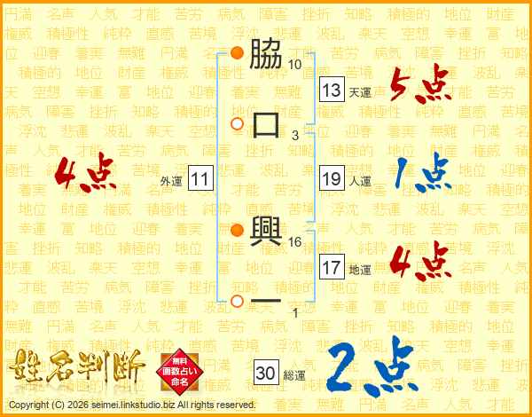 生活面を象徴する運勢です。外部から受ける影響力を表し、結婚運、家庭運や職場、環境への順応性を表します。総運から人運を引いた画数。姓や名が1文字の場合を除く。