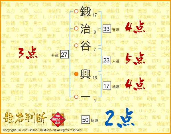 鍛(17画)治(9画)谷(7画) 興(16画)一(1画)