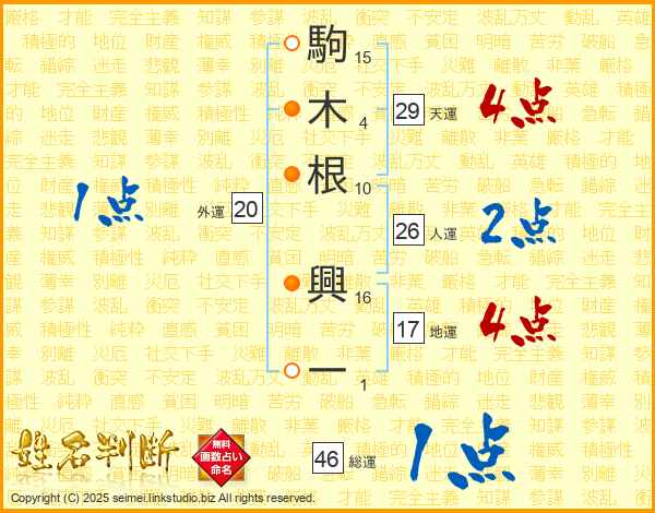 駒(15画)木(4画)根(10画) 興(16画)一(1画)