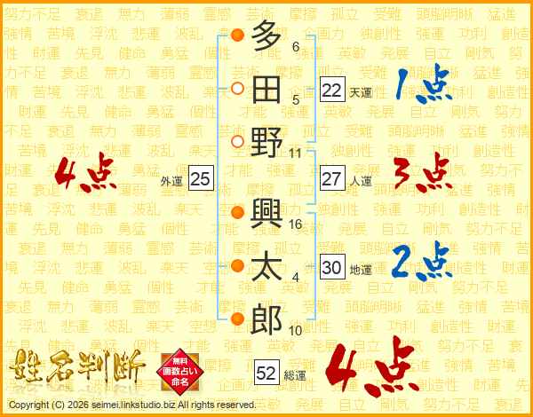 多田野興太郎さんの総運は52画の4点!