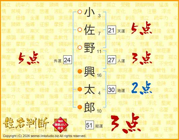 小(3画)佐(7画)野(11画) 興(16画)太(4画)郎(10画)
