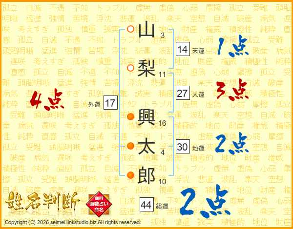 山(3画)梨(11画) 興(16画)太(4画)郎(10画)