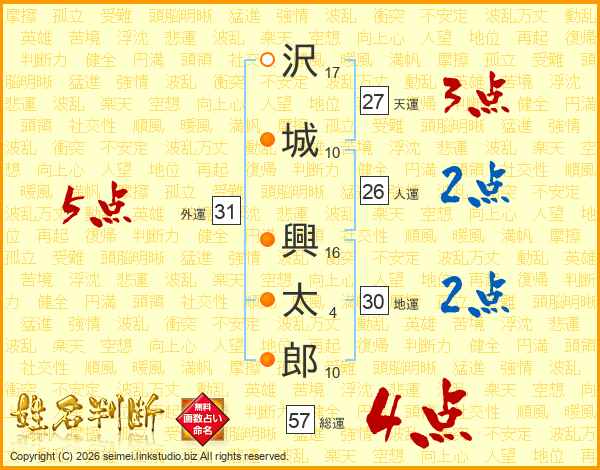 沢(17画)城(10画) 興(16画)太(4画)郎(10画)