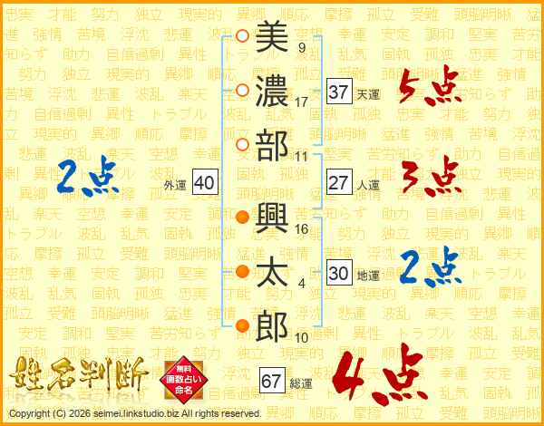 美(9画)濃(17画)部(11画) 興(16画)太(4画)郎(10画)