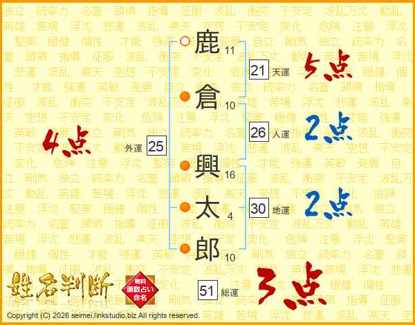 鹿(11画)倉(10画) 興(16画)太(4画)郎(10画)