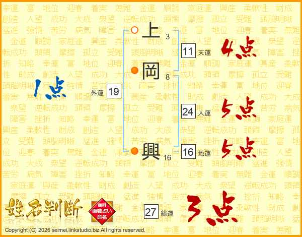 上(3画)岡(8画) 興(16画)