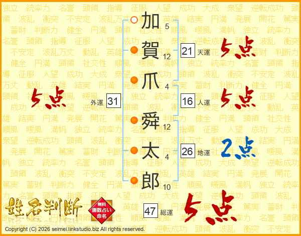 加(5画)賀(12画)爪(4画) 舜(12画)太(4画)郎(10画)