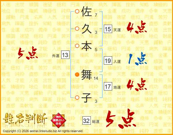 佐(7画)久(3画)本(5画) 舞(14画)子(3画)