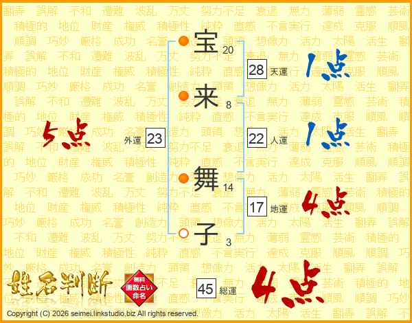 宝(20画)来(8画) 舞(14画)子(3画)