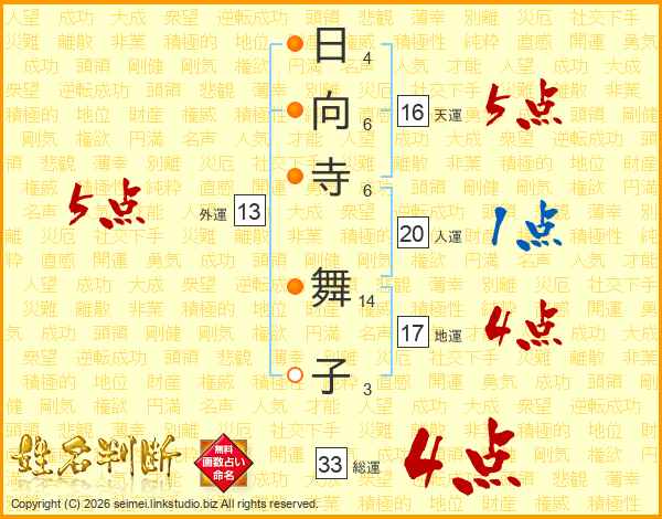 日(4画)向(6画)寺(6画) 舞(14画)子(3画)