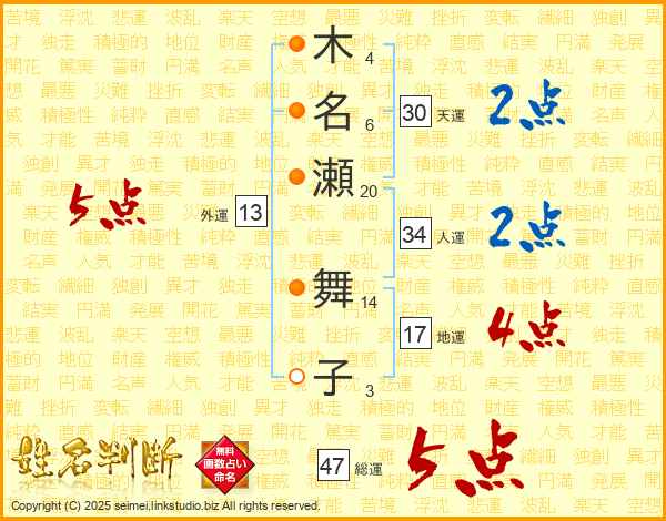 木(4画)名(6画)瀬(20画) 舞(14画)子(3画)