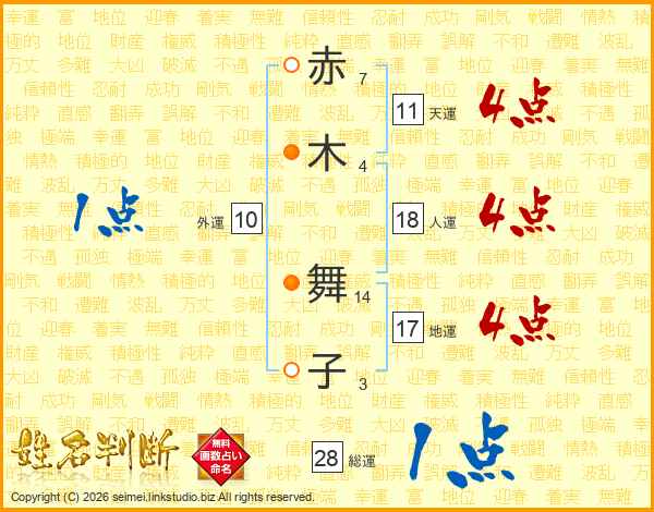 あなたの人生を表す1番重要な運勢です。生涯を通じて影響する総合運となり、主に50歳以降の晩年期に影響を及ぼします。苗字と名前の合計画数。