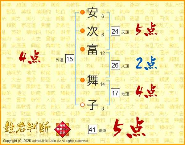 安(6画)次(6画)富(12画) 舞(14画)子(3画)