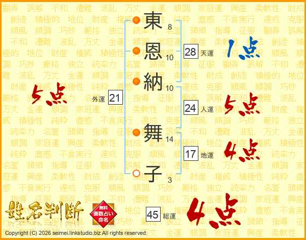 東(8画)恩(10画)納(10画) 舞(14画)子(3画)