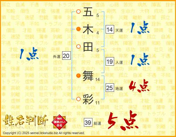 五(5画)木(4画)田(5画) 舞(14画)彩(11画)