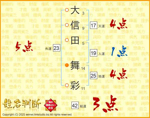 大(3画)信(9画)田(5画) 舞(14画)彩(11画)