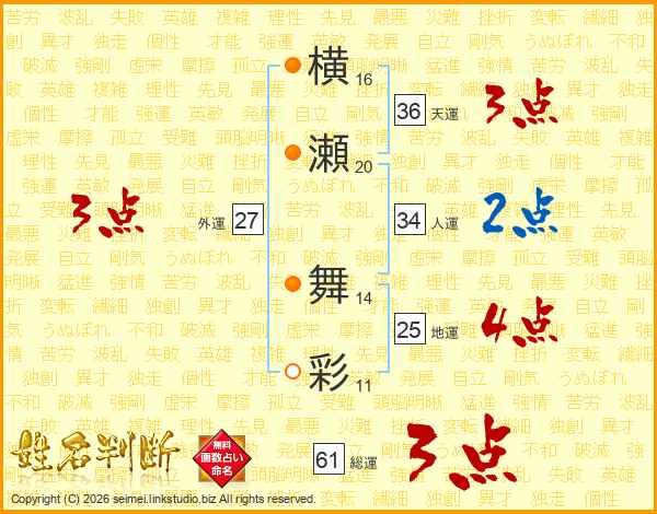 横(16画)瀬(20画) 舞(14画)彩(11画)