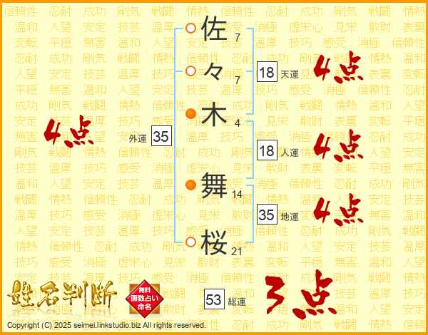 佐(7画)々(7画)木(4画) 舞(14画)桜(21画)