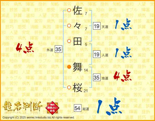 佐(7画)々(7画)田(5画) 舞(14画)桜(21画)