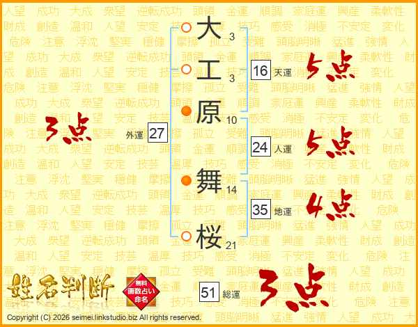 大(3画)工(3画)原(10画) 舞(14画)桜(21画)