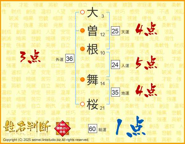 大(3画)曽(12画)根(10画) 舞(14画)桜(21画)
