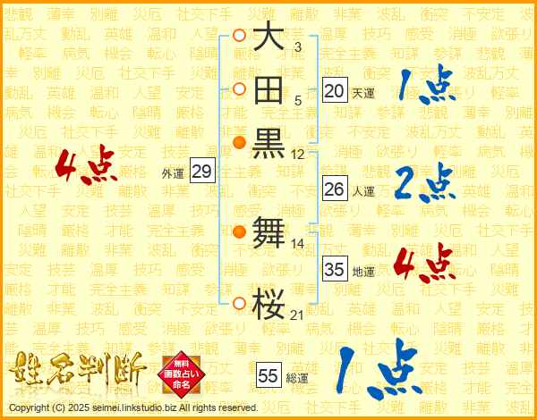 大(3画)田(5画)黒(12画) 舞(14画)桜(21画)