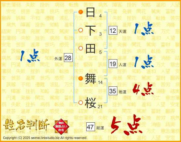日(4画)下(3画)田(5画) 舞(14画)桜(21画)