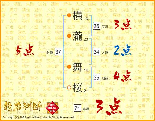横瀧舞桜さんの総運は71画の3点!
