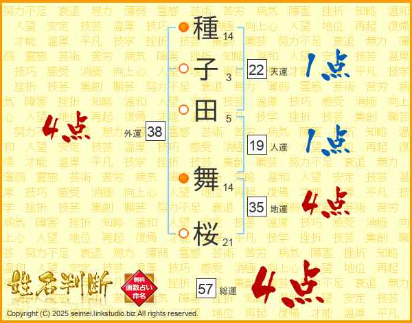 種(14画)子(3画)田(5画) 舞(14画)桜(21画)