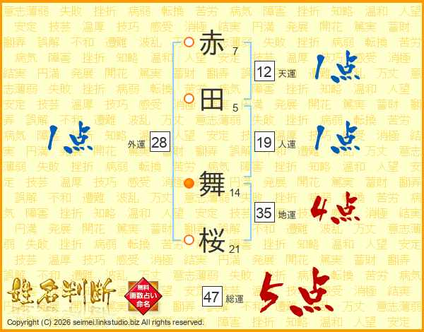 赤(7画)田(5画) 舞(14画)桜(21画)