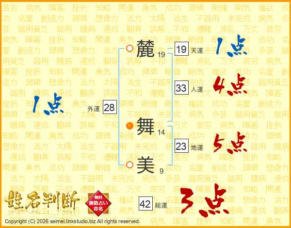 生活面を象徴する運勢です。外部から受ける影響力を表し、結婚運、家庭運や職場、環境への順応性を表します。総運から人運を引いた画数。姓や名が1文字の場合を除く。