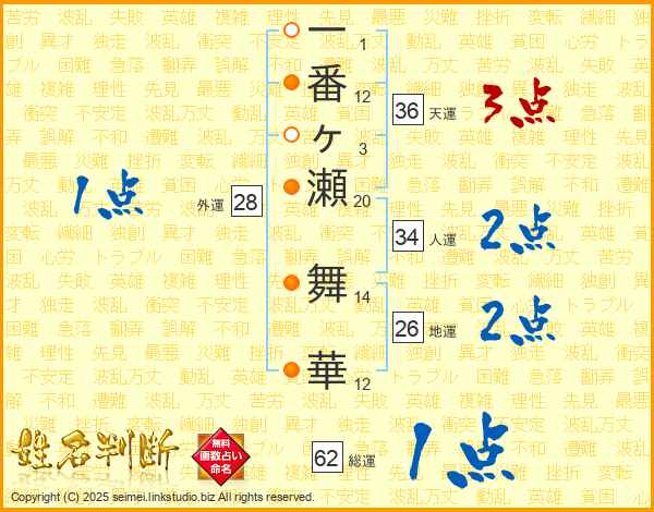 一番ヶ瀬舞華さんの人運は34画の2点!