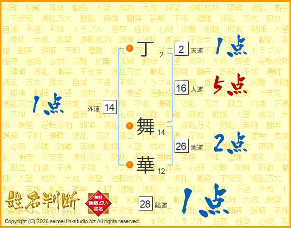 生活面を象徴する運勢です。外部から受ける影響力を表し、結婚運、家庭運や職場、環境への順応性を表します。総運から人運を引いた画数。姓や名が1文字の場合を除く。
