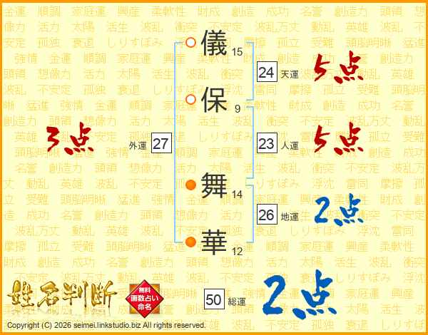 儀(15画)保(9画) 舞(14画)華(12画)