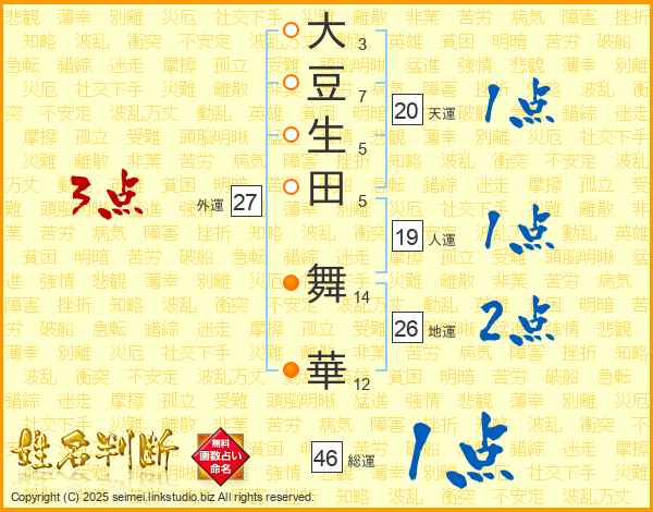 大(3画)豆(7画)生(5画)田(5画) 舞(14画)華(12画)
