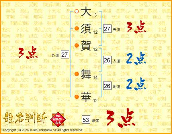 大(3画)須(12画)賀(12画) 舞(14画)華(12画)